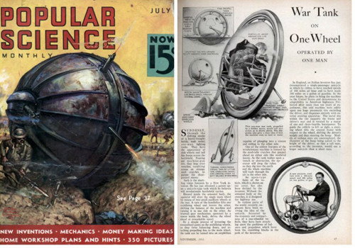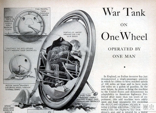 Trong số đó, chiếc One Wheeled chính là ý tưởng của người Đức trong những năm 1930. Bản vẽ thiết kế của nó trông giống như một đĩa bay dựng đứng. Phía trong bánh xe là vị trí của lái xe vừa điều khiển xe vừa điều khiển hỏa lực. Phía sau bánh xe chính có 2 bánh xe nhỏ để duy trì sự cân bằng. Tuy nhiên, do hạn chế về kỹ thuật cũng như thiếu tính hiệu quả, đã không có một chiếc One Wheeled nào được sản xuất.