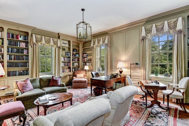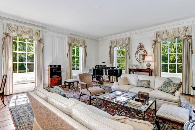 Phòng khách mang vẻ đẹp cổ điển với tông màu be sang trọng từ bộ sofa và những tấm rèm cửa. Các ô cửa sổ cỡ lớn mang đến cảnh vật xung quanh cũng như ánh sáng tự nhiên.