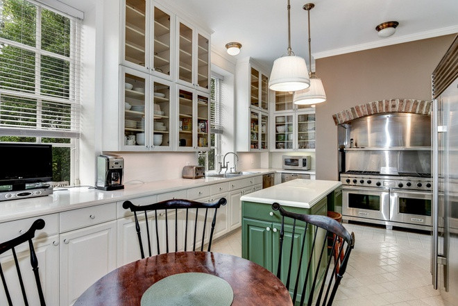 Khu vực nhà bếp được sắp đặt gọn gàng với các trang thiết bị nấu nướng hiện đại tích hợp trong những chiếc tủ cỡ lớn. Sàn gạch men tăng thêm vẻ sang trọng cho căn phòng.