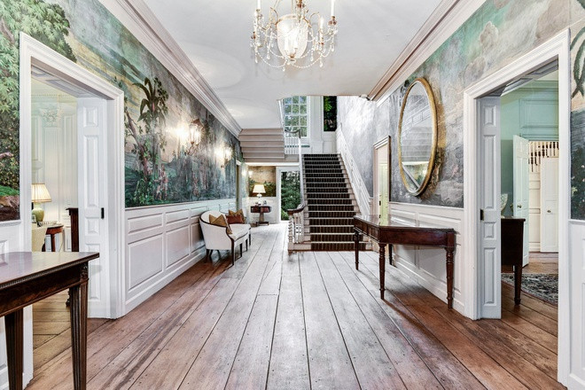 Tiền sảnh thông thoáng dẫn đến những khu vực sinh hoạt khác nhau trong ngôi nhà. Các bức tường được trang trí cầu kỳ với giấy dán tái hiện lại khung cảnh nước Pháp.