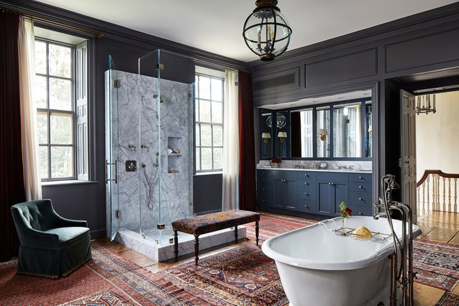 Phòng tắm chính sang trọng, mang một tông màu xanh độc đáo cùng một số nội thất cầu kỳ được nhập khẩu từ Thụy Điển.