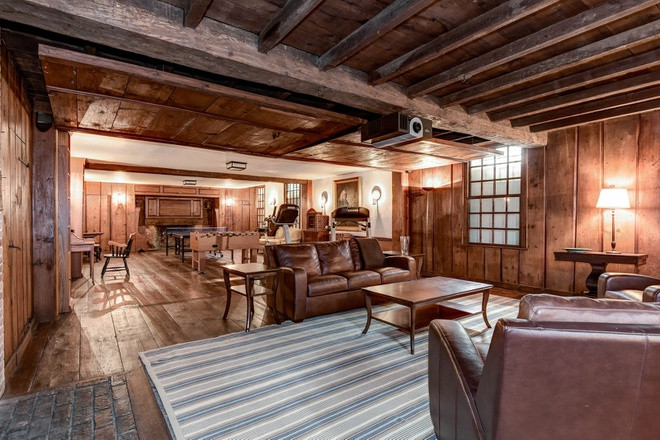 Một khu vực giải trí thú vị ở tầng hầm được lát gỗ xung quanh và đi kèm với một quầy bar nhỏ nhắn.
