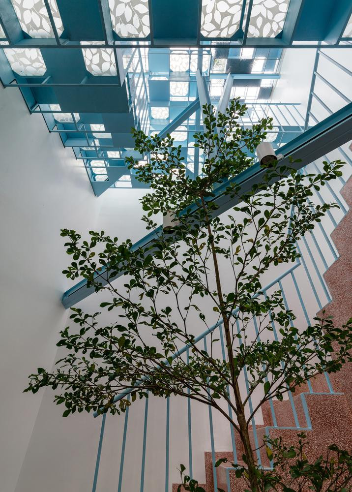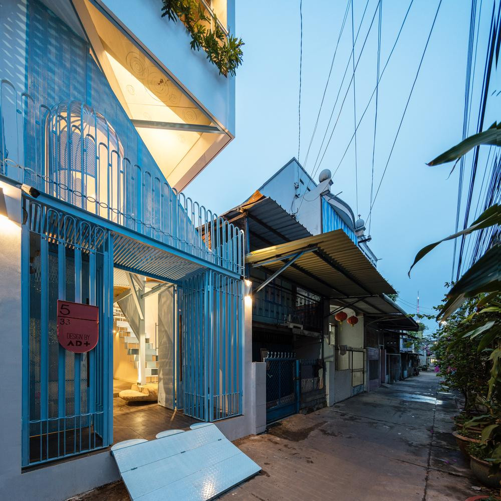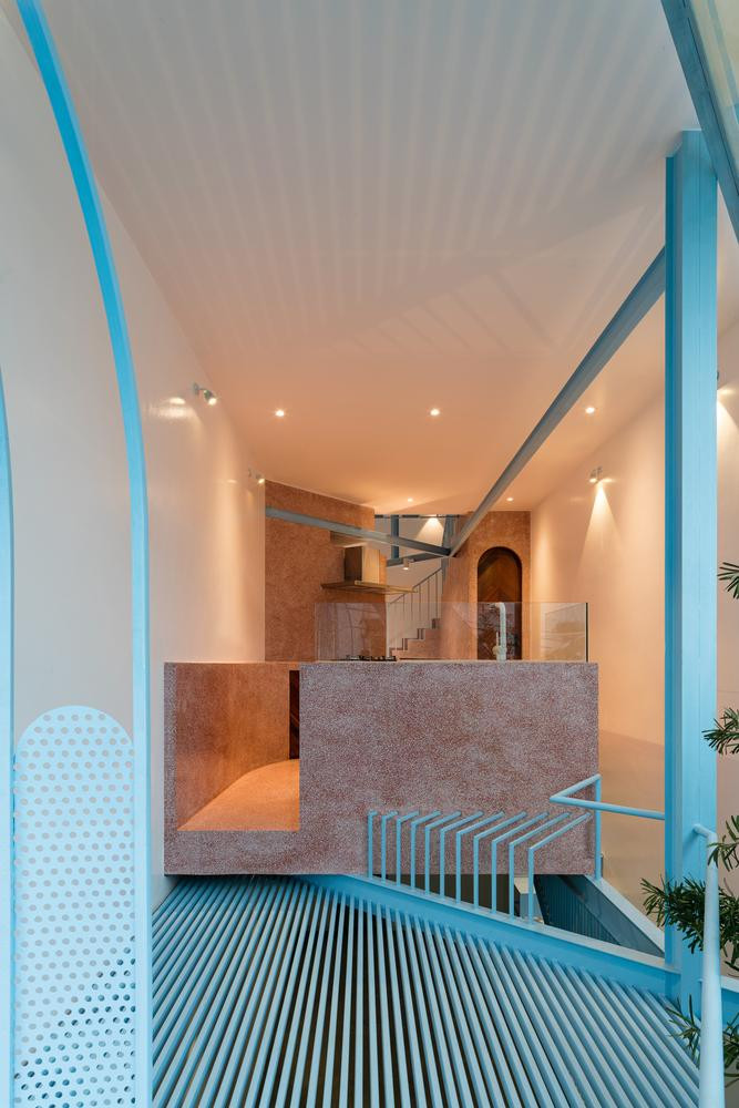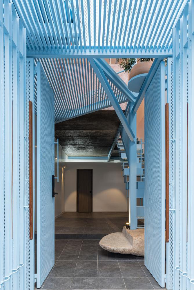| Để thông gió và tăng độ nhận diện cho ngôi nhà, kiến trúc sư sử dụng cửa sắt lỗ màu xanh. |