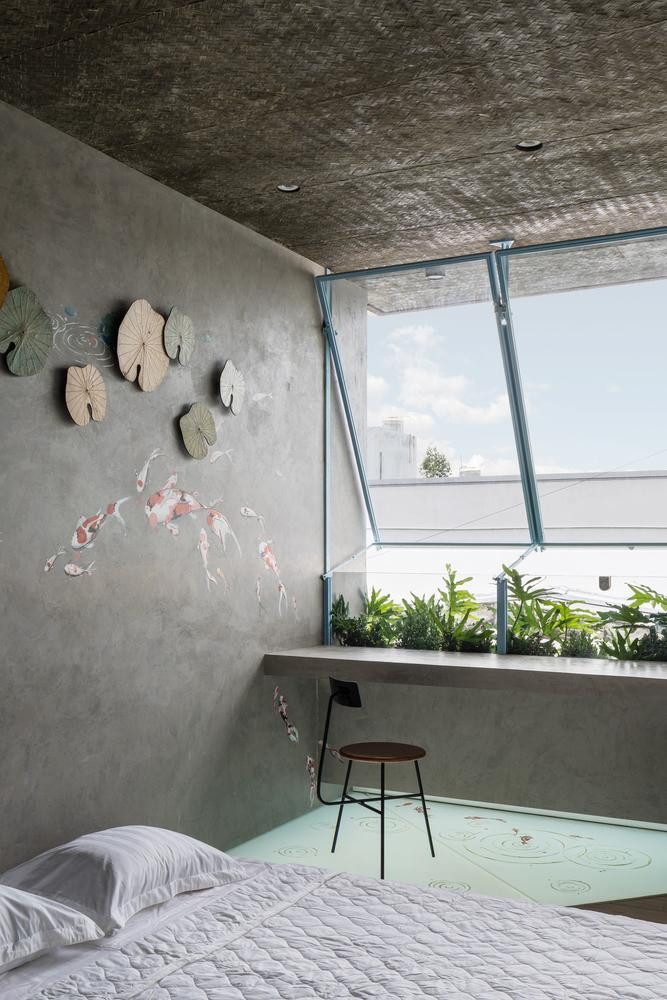 | Phòng ngủ có một bàn làm việc bên cạnh cửa sổ kính lớn. |
