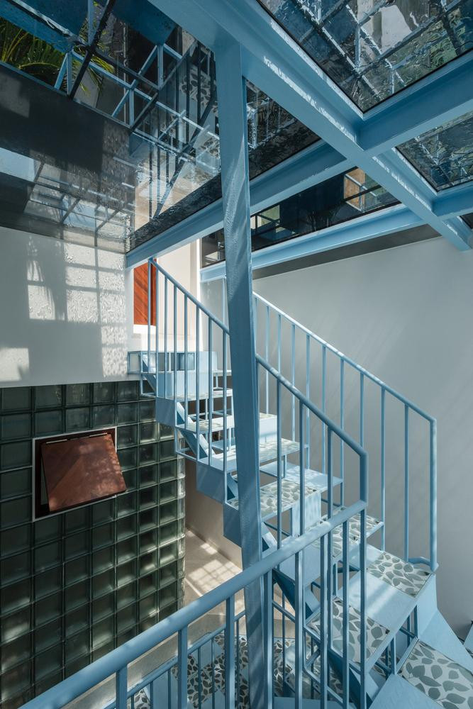 | Giếng trời bên trên cầu thang lỗ sắt giúp mọi không gian trong nhà luôn tràn ngập ánh sáng vào ban ngày. |