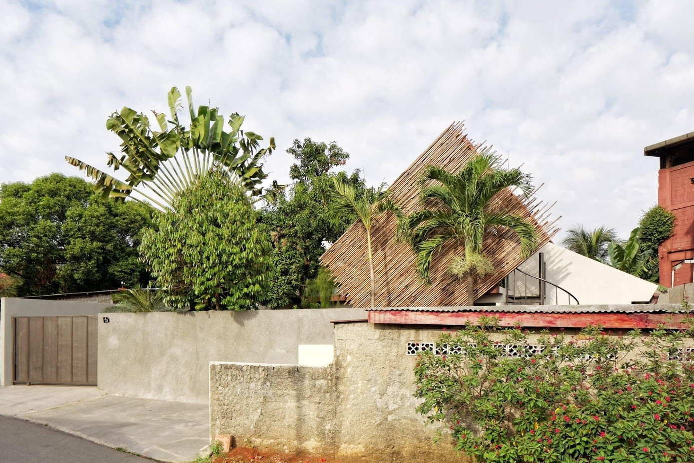 | Sự ấn tượng của ngôi nhà là tấm màn gỗ chắn có thể nhìn xuyên qua ở mặt tiền. Màn gỗ này được làm từ vật liệu tái sử dụng, màn gỗ đặt chéo vừa tạo được bóng râm tự nhiên, tăng tính riêng tư, vừa giúp công trình mang hình bóng của một ngôi nhà mái tranh thời xưa. |