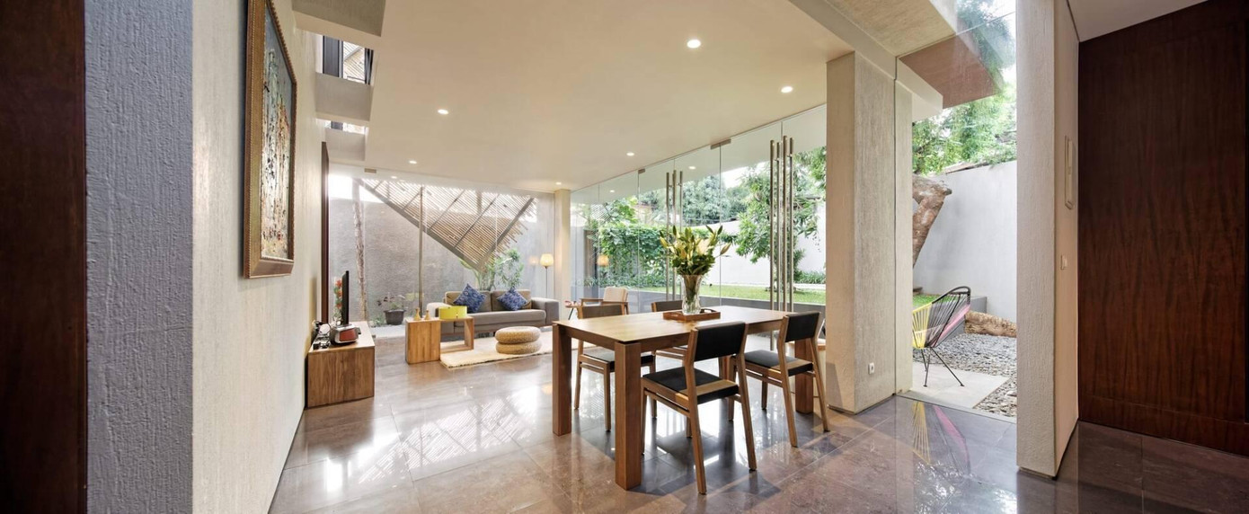 | Tại tầng 1, phòng khách, phòng ăn và bếp được thiết kế liền mạch để tạo thành không gian mở. Tại đây, KTS sử dụng cửa kính lớn hướng tầm nhìn ra khu vườn ngoài trời, để xóa mờ ranh giới trong ngoài. |