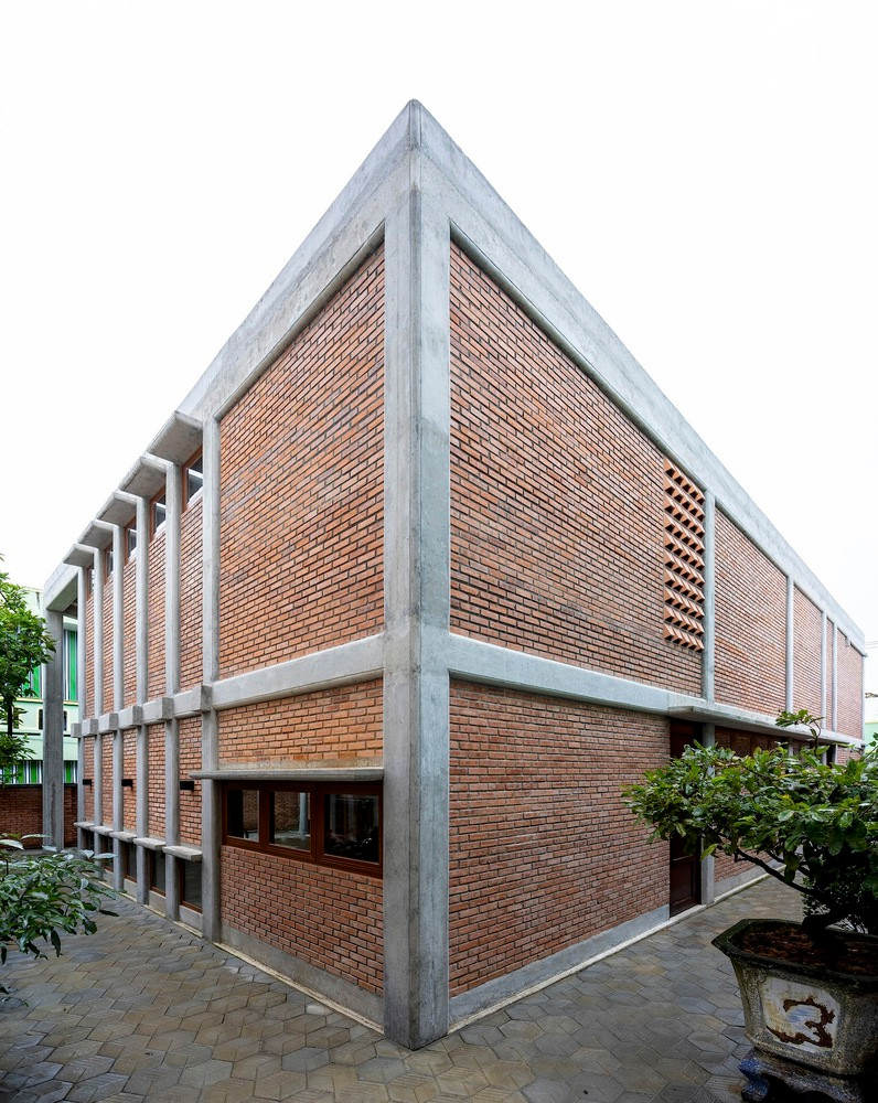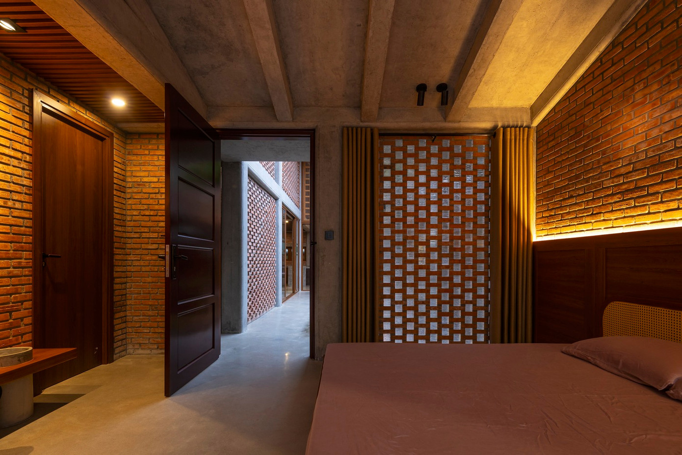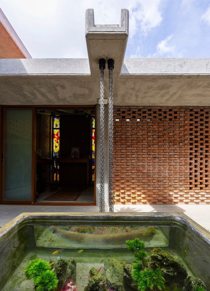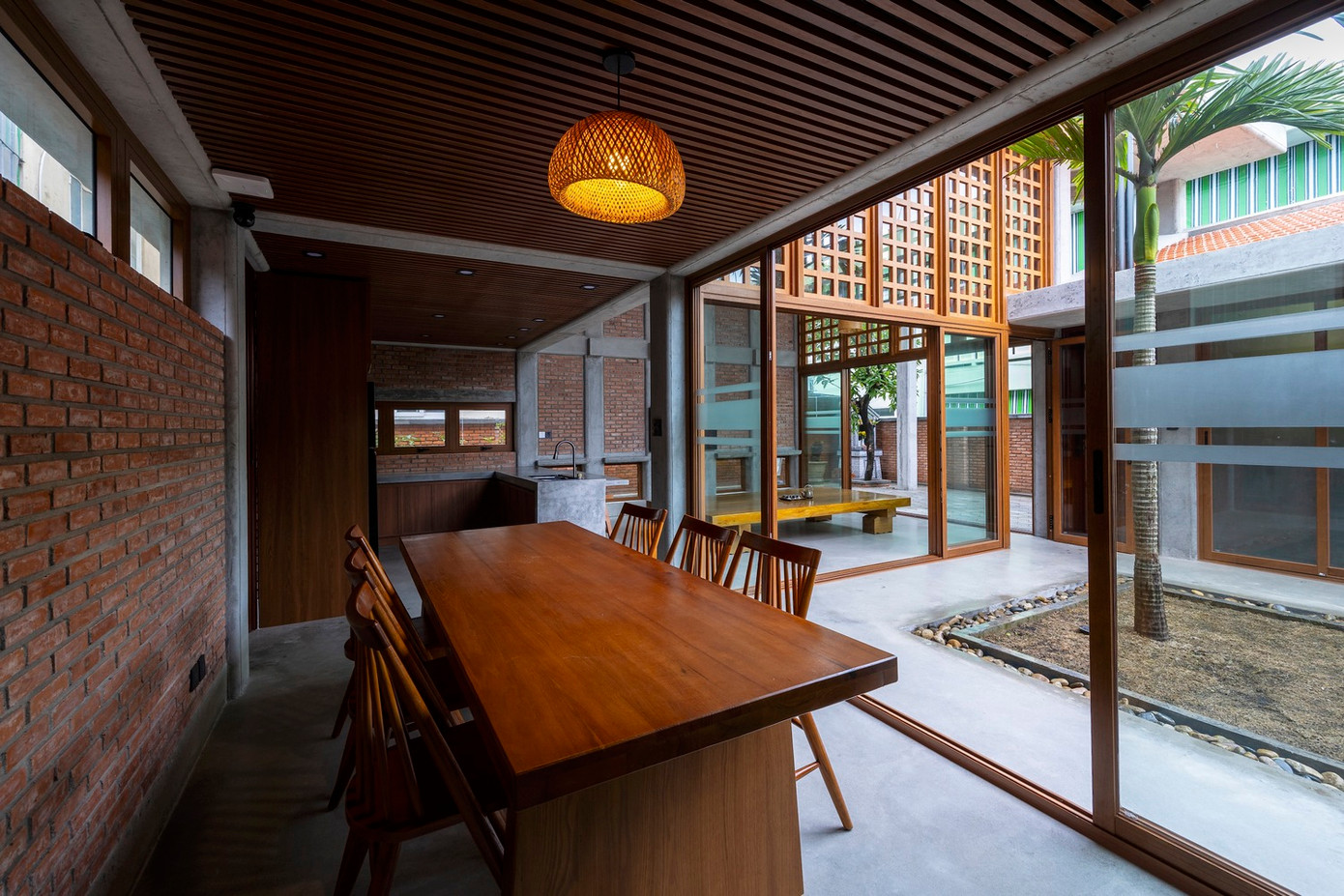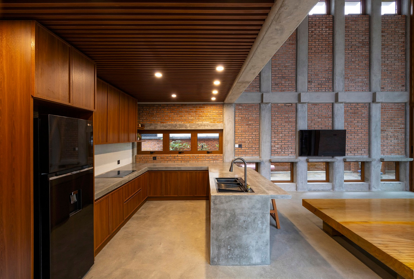 Với kết cấu hoàn toàn bằng bê tông, gạch mộc và gỗ, ngôi nhà vừa đáp ứng được yêu cầu về hình thức kiến trúc mới, hiện đại vừa tạo cảm giác quen thuộc nhờ sự kế thừa và lồng ghép lối sống truyền thống.