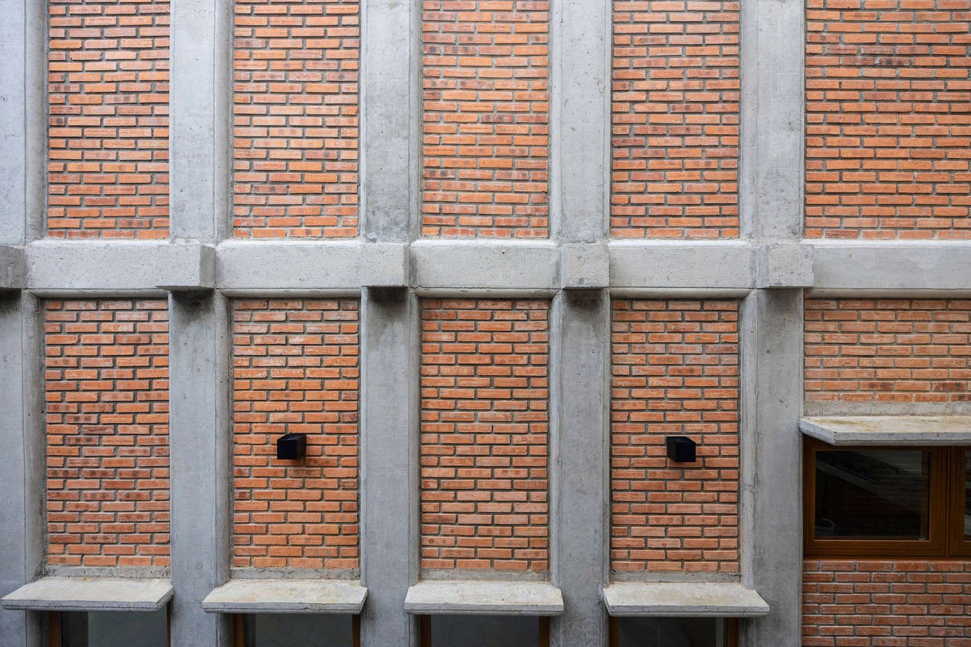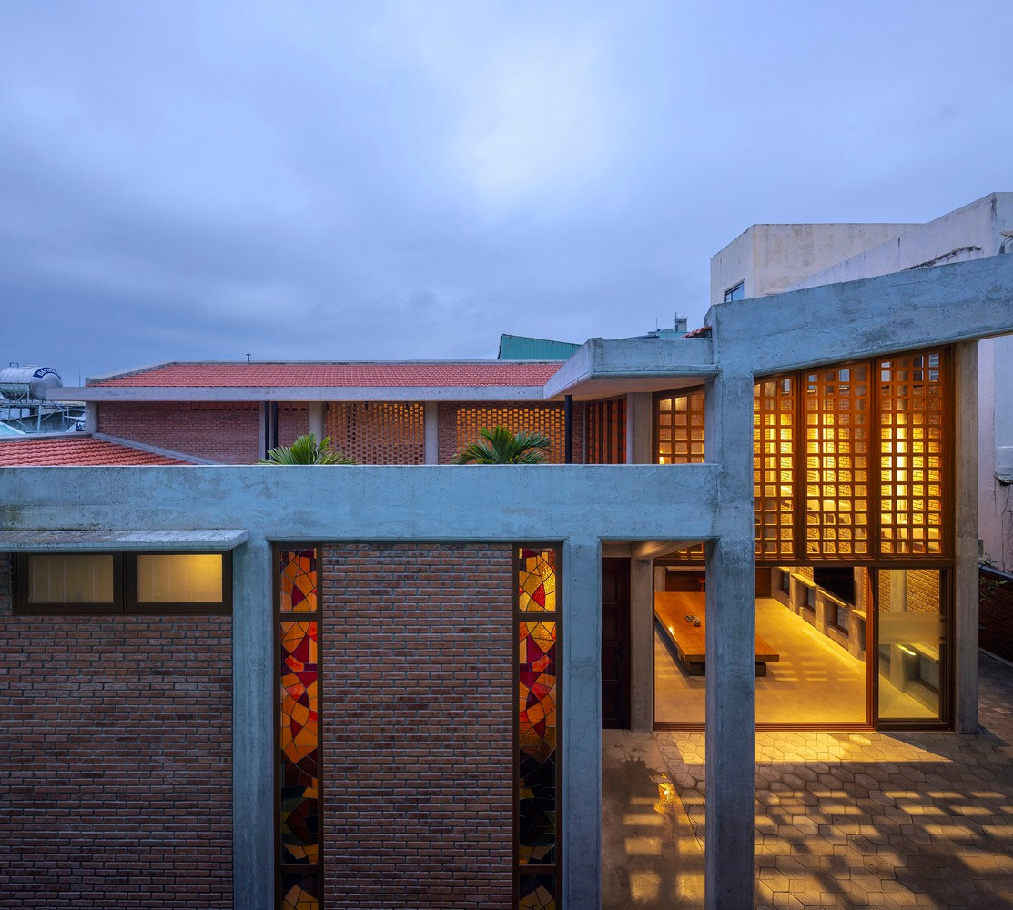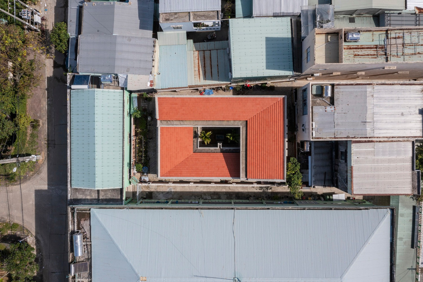 Nằm trong vùng dân cư đông đúc, ngôi nhà nổi bật với diện mạo mộc mạc và mái ngói đỏ tươi bao quanh một sân trong ở chính giữa.