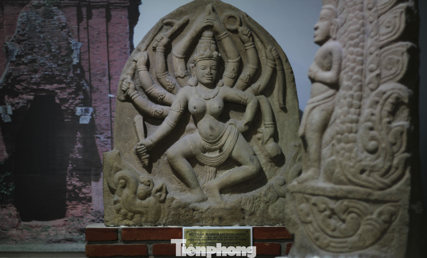 Phù điêu nữ thần Sarasvati. Ảnh: Trương Định Phù điêu còn tương đối nguyên vẹn, chỉ bị xước nhỏ ở phần mũi. Phù điêu nữ thần Sarasvati có chất liệu đá sa thạch, chiều cao 80 cm, rộng 60 cm, dày 26 cm, trọng lượng khoảng 200 kg.