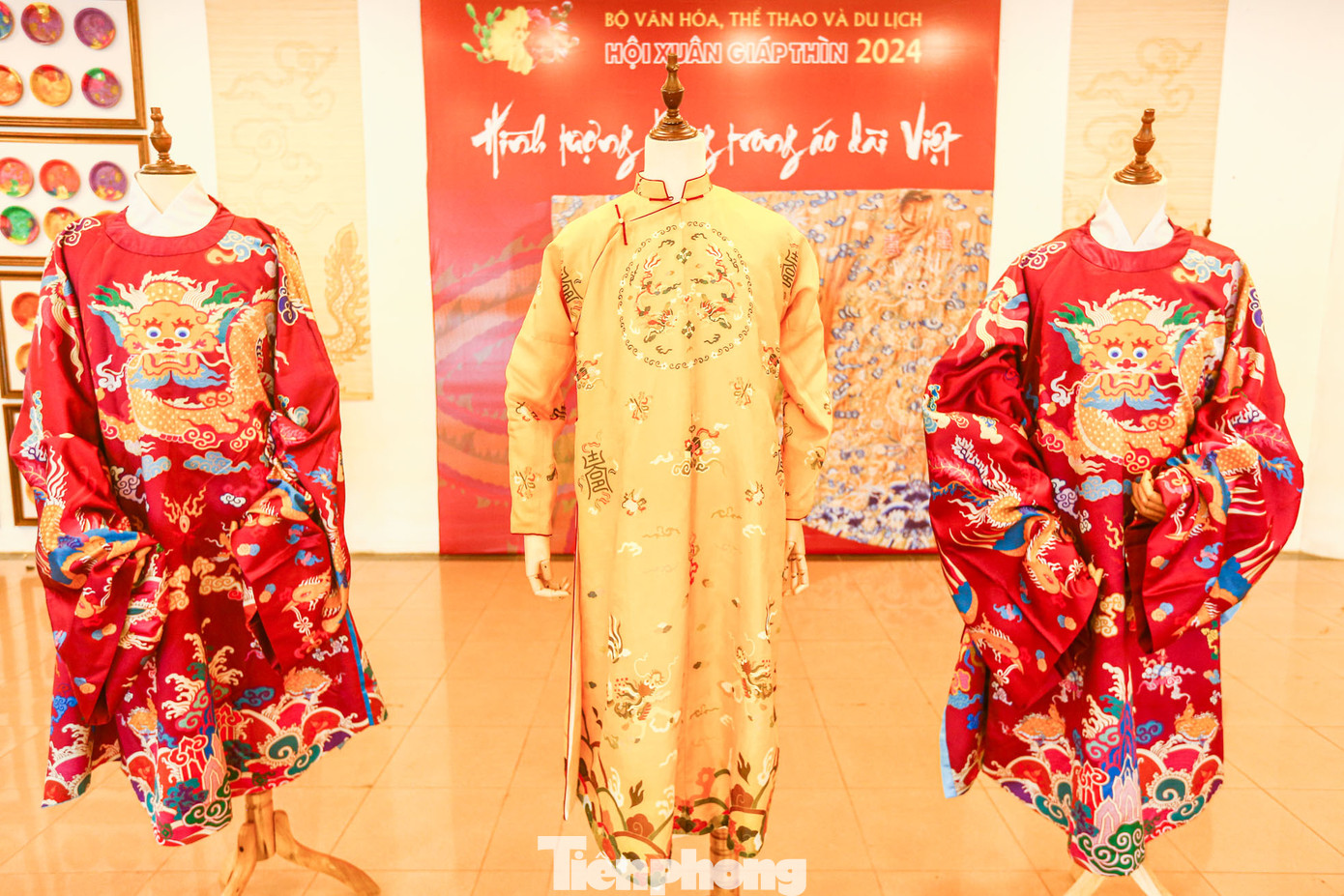 | Bên cạnh triển lãm về rồng, BTC cũng giới thiệu 20 thiết kế được nghiên cứu, phỏng dựng lại từ triều phục cổ với hình ảnh rồng thêu trên long bào, mãng bào và bộ sưu tập áo dài “Vân long lưu vũ” gồm áo dài trên chất liệu tơ tằm khai thác hình tượng mỹ thuật cổ về rồng thời Lý, Trần và Nguyễn; |