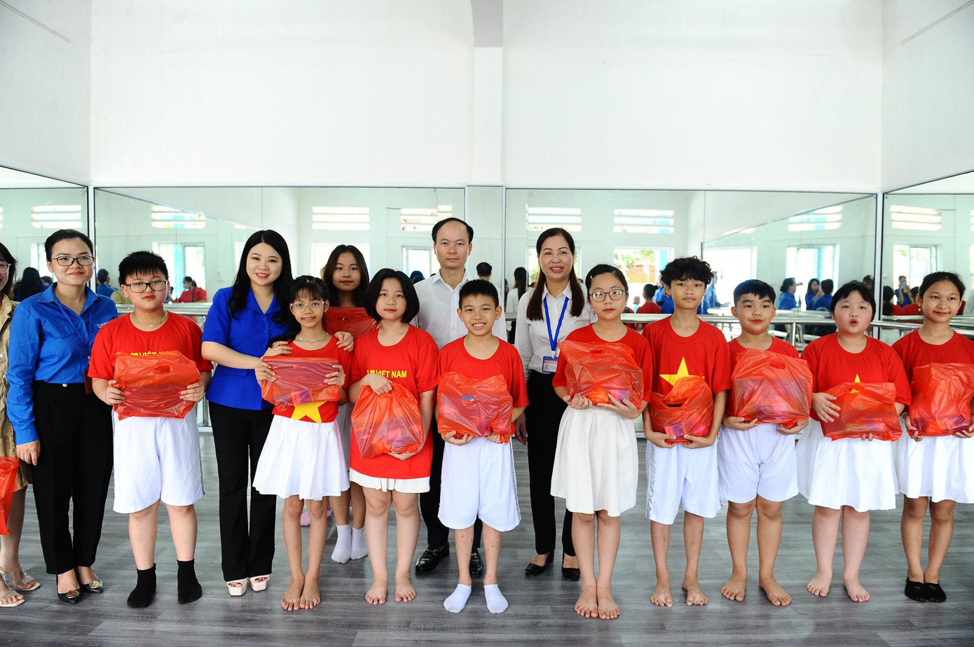| Chị Chu Hồng Minh, Bí thư Thành Đoàn Hà Nội tặng quà cho các em thiếu nhi tại chương trình |