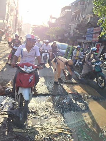 Giữa thời tiết oi bức của mùa hè Hà Nội, hình ảnh chiến sĩ cảnh sát tay cầm xẻng, tay cầm xô một mình lấp đầy hố sâu làm ách tắc giao thông nhanh chóng được người đi đường chụp lại.