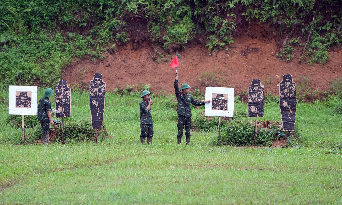 Các cán bộ, chiến sĩ dân quân tự vệ đã thực hiện bài bắn mục tiêu cố định ban ngày bằng súng tiểu liên AK, cự ly 100m, với 3 tư thế.