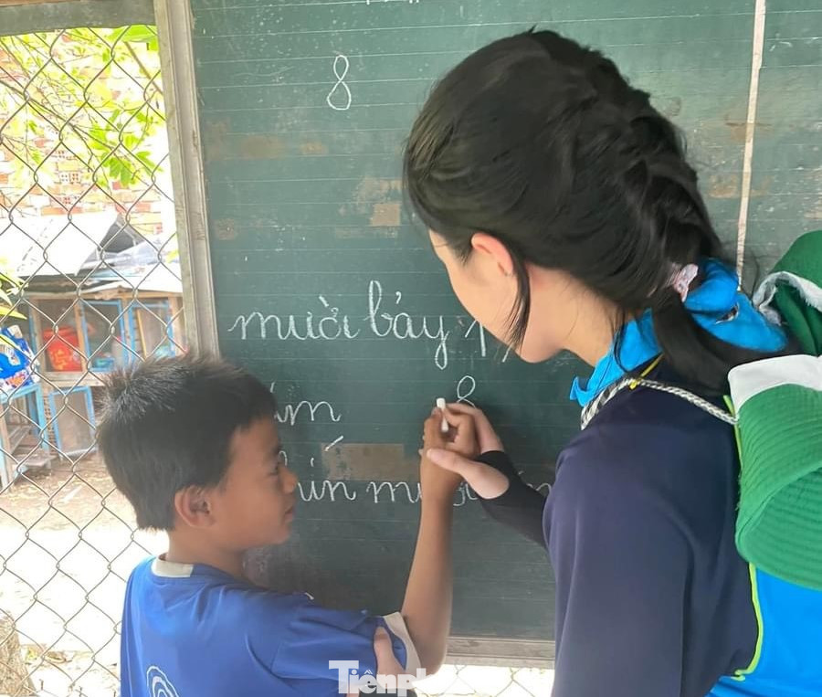 | Chiến sĩ tình nguyện hướng dẫn các em học bài. |