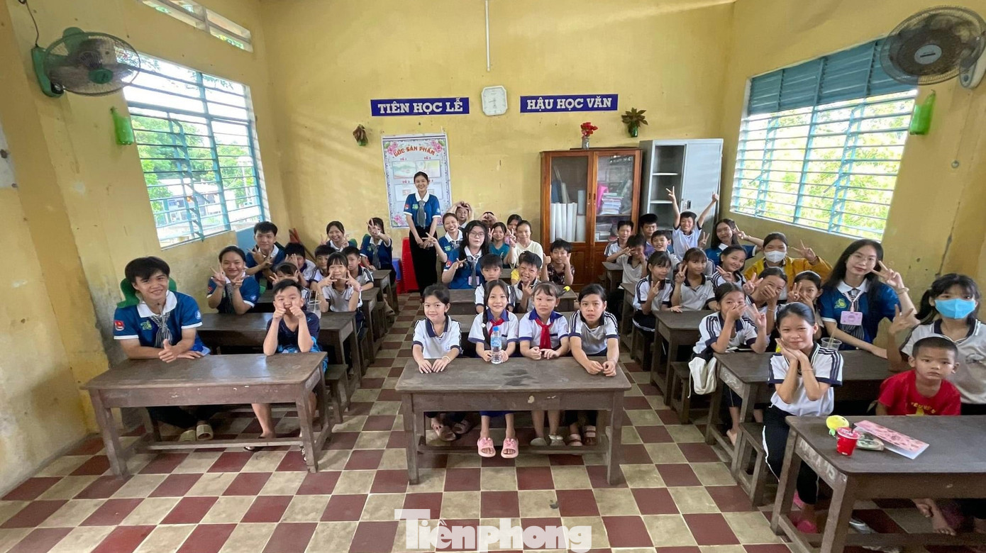 | Bạn Nguyễn Ngọc Thanh Tuyền bên cạnh các em nhỏ vùng biên. Ảnh: Hòa Hội |