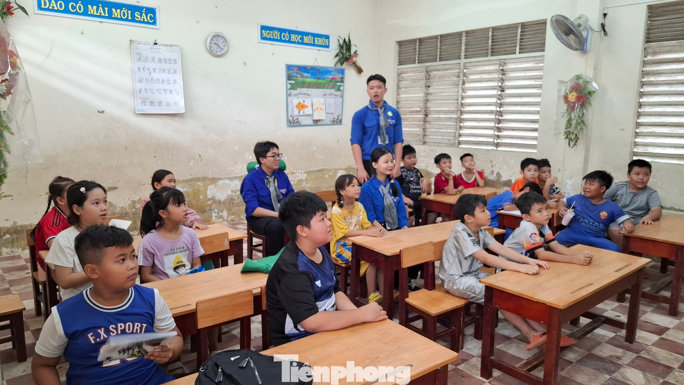 | Chiến sĩ tình nguyện hướng dẫn học sinh ôn tập hè. |