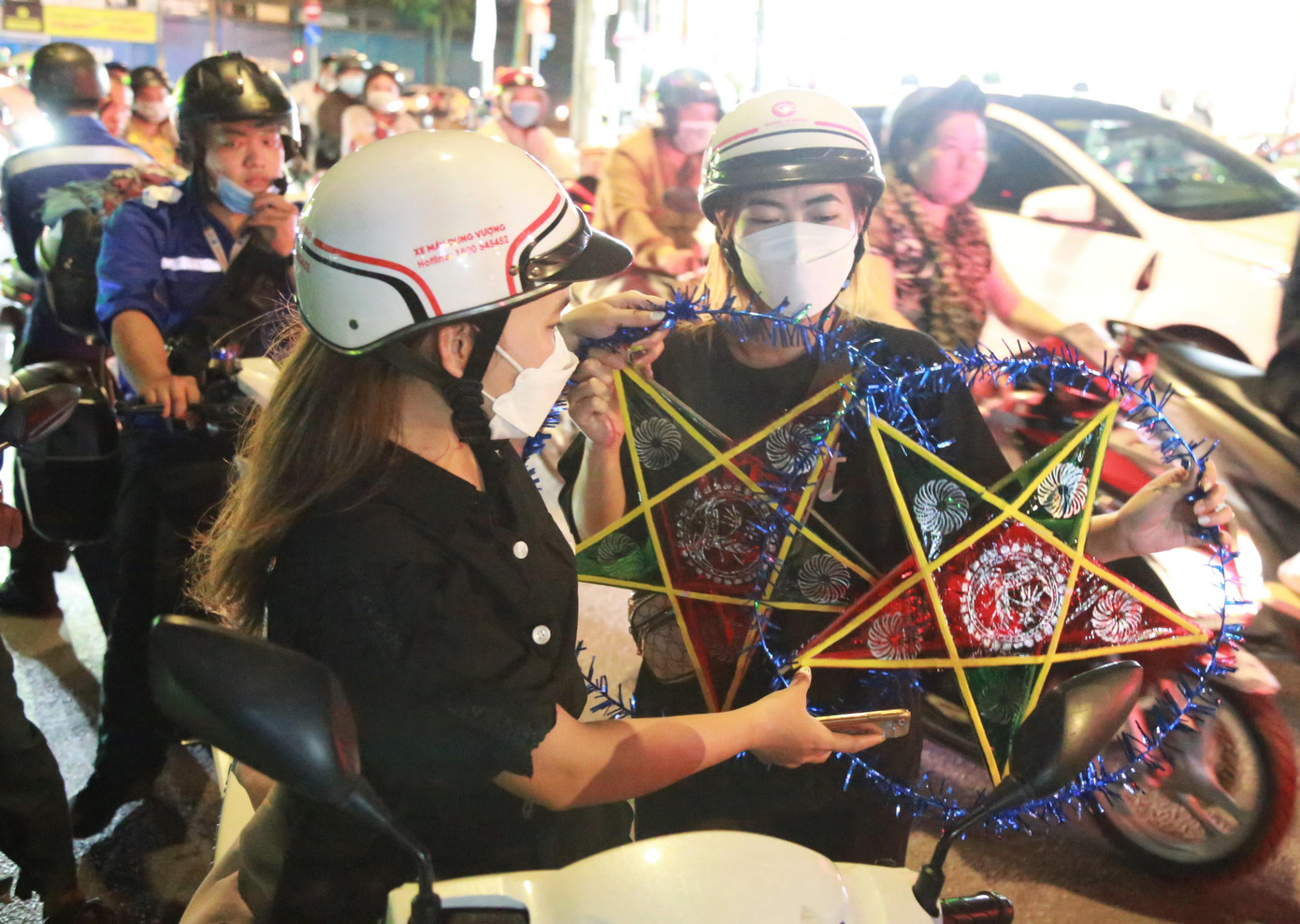 | Các thành viên Đội Hỗ trợ giao thông quận 12 phối hợp Đội Hỗ trợ nhân dân Thạnh Lộc mang quà trung thu đi tặng các bạn nhỏ trên đường phố. |