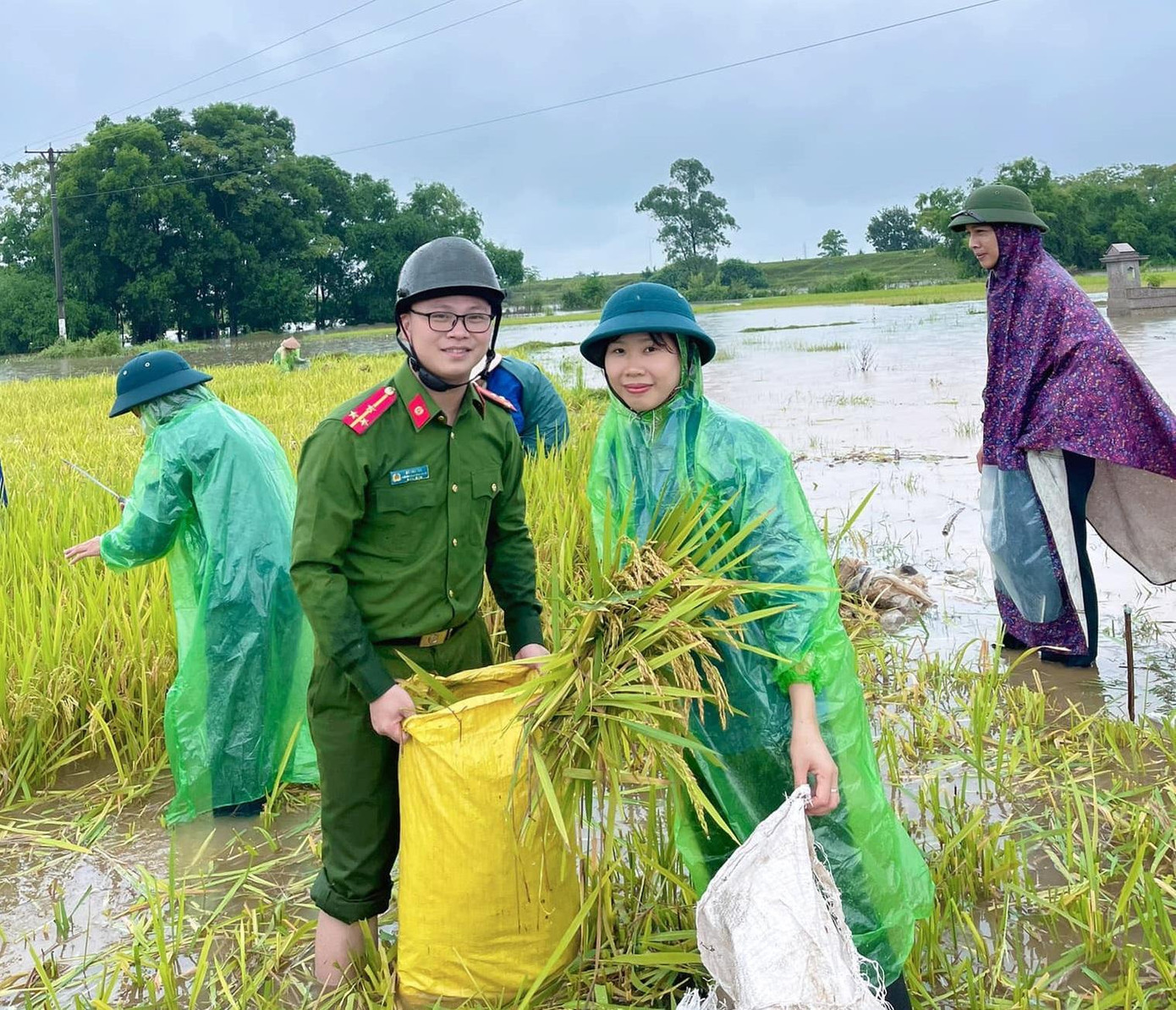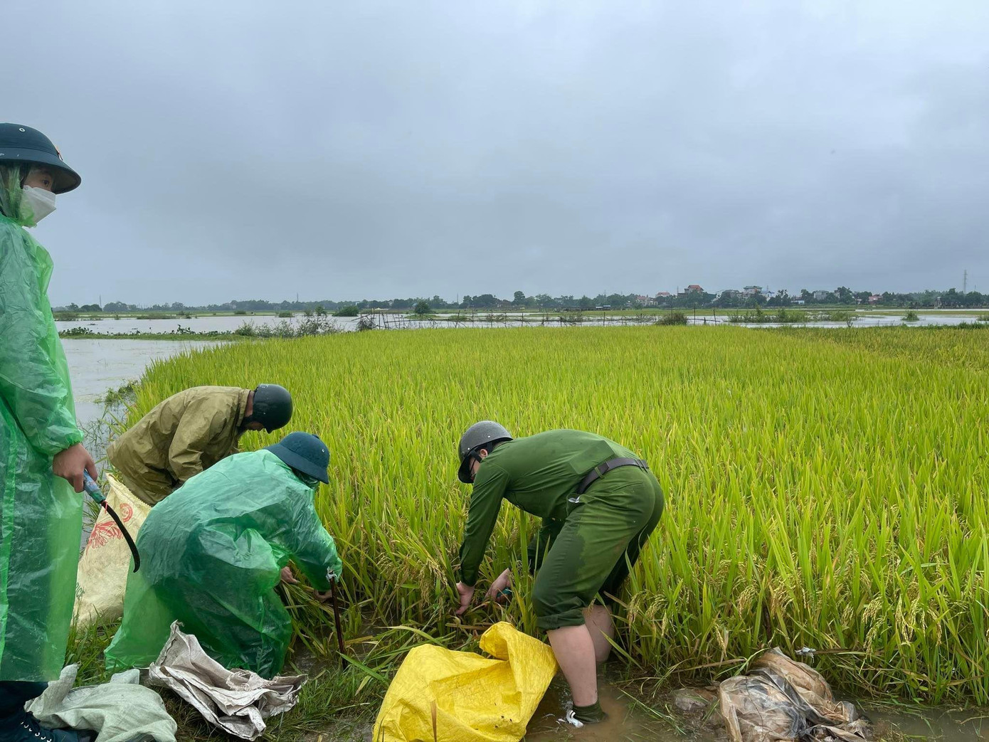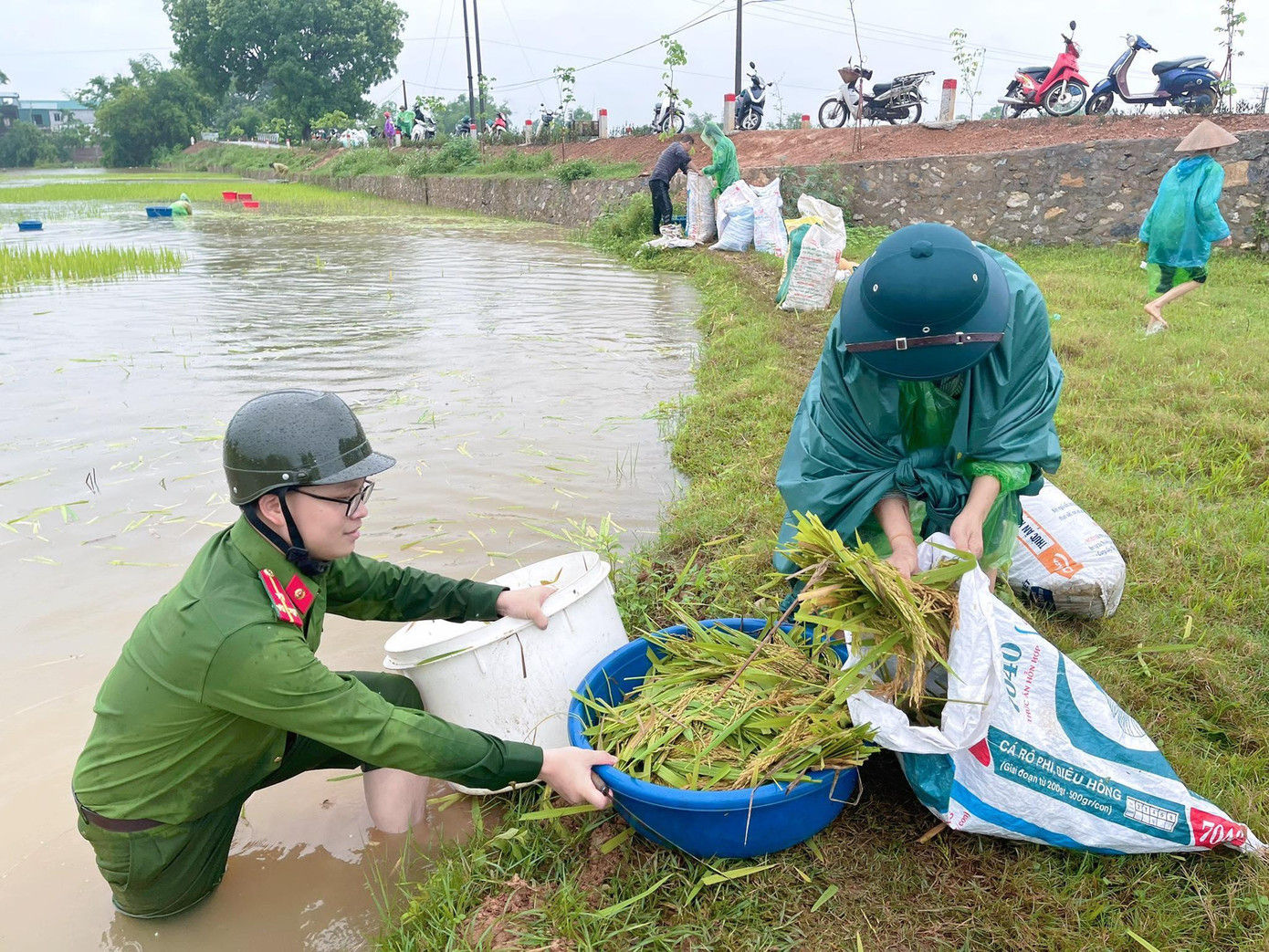 Công an xã Lại Thượng phối hợp với Đoàn Thanh niên xã và các đơn vị khẩn trương xuống đồng cùng nhân dân cứu lúa.