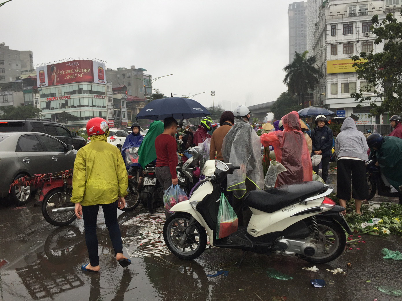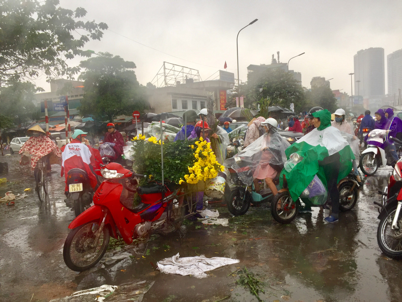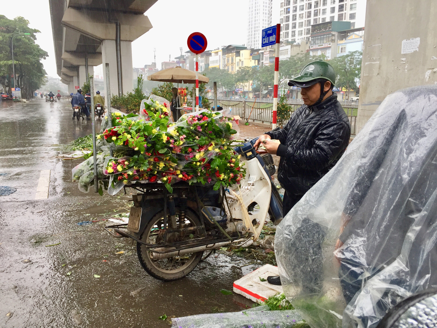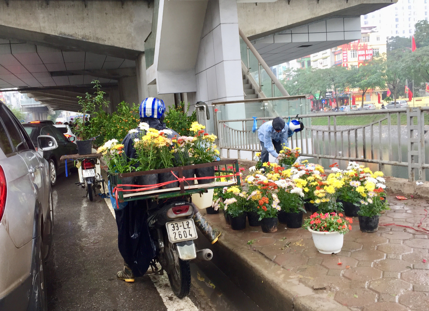 Trên đường Nguyễn Trãi, khu vực ngoài chợ Ngã Tư Sở tập trung nhiều nhiều xe bán hoa, cây cảnh chiều 30 Tết. Dưới cơn mưa nặng hạt, nhiều người đi xe máy đội nguyên mũ bảo hiểm, trùm kín áo mưa, nán lại chọn cẩn thận từng bông hoa
