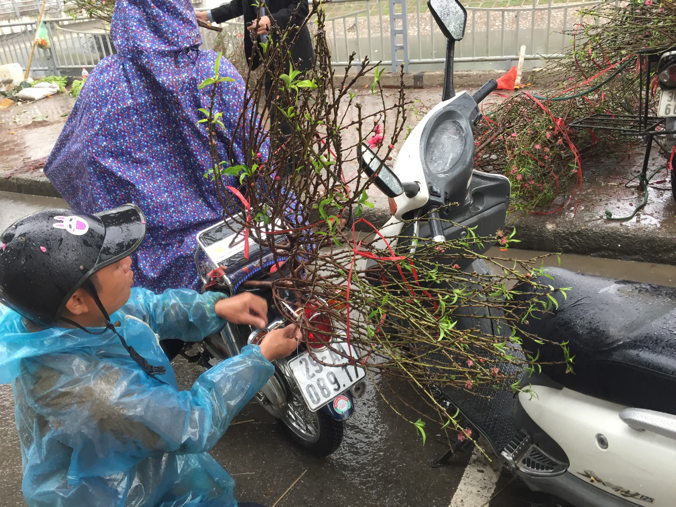 Sạp hàng “cơ động” trên xe máy, dưới trời mưa nặng hạt, người bán trùm kín áo mưa, vất vả chào mời khách qua đường. Số đào còn lại, cành đắt khoảng 150.000 đồng