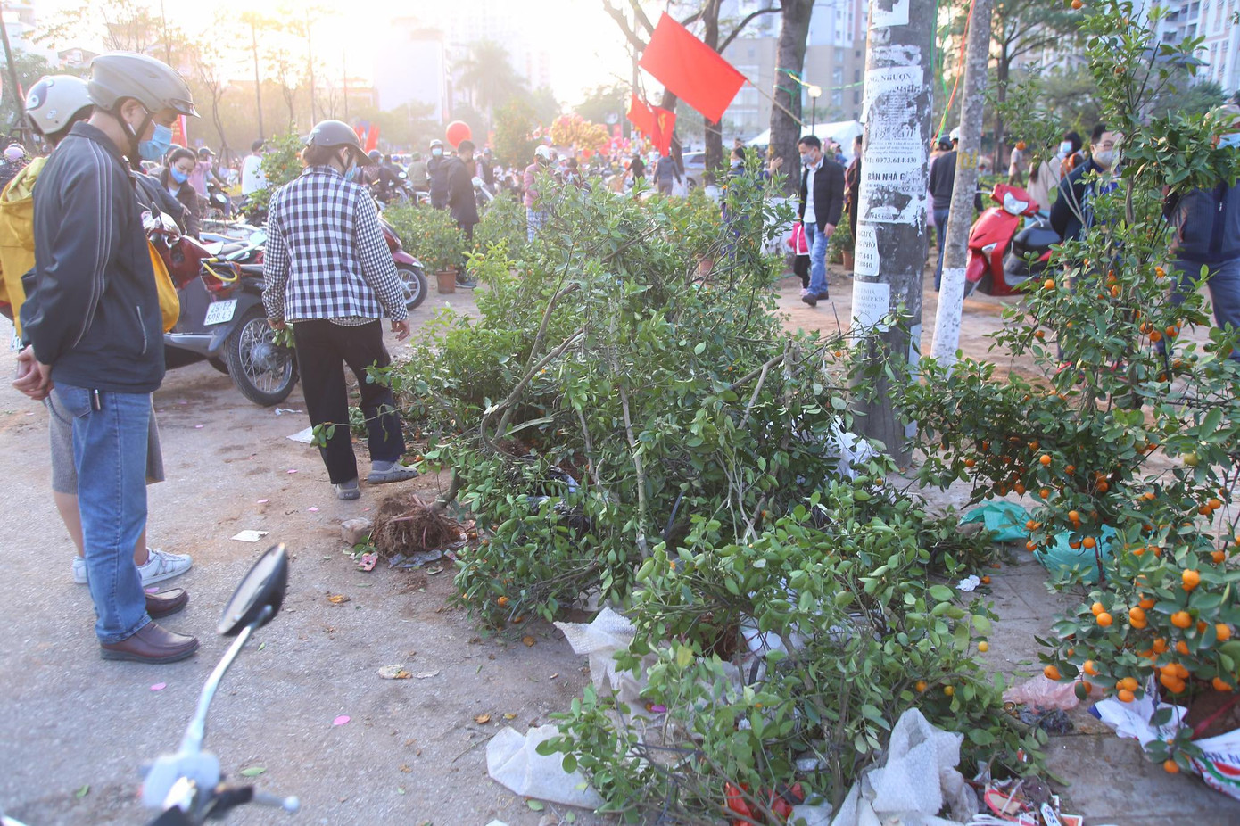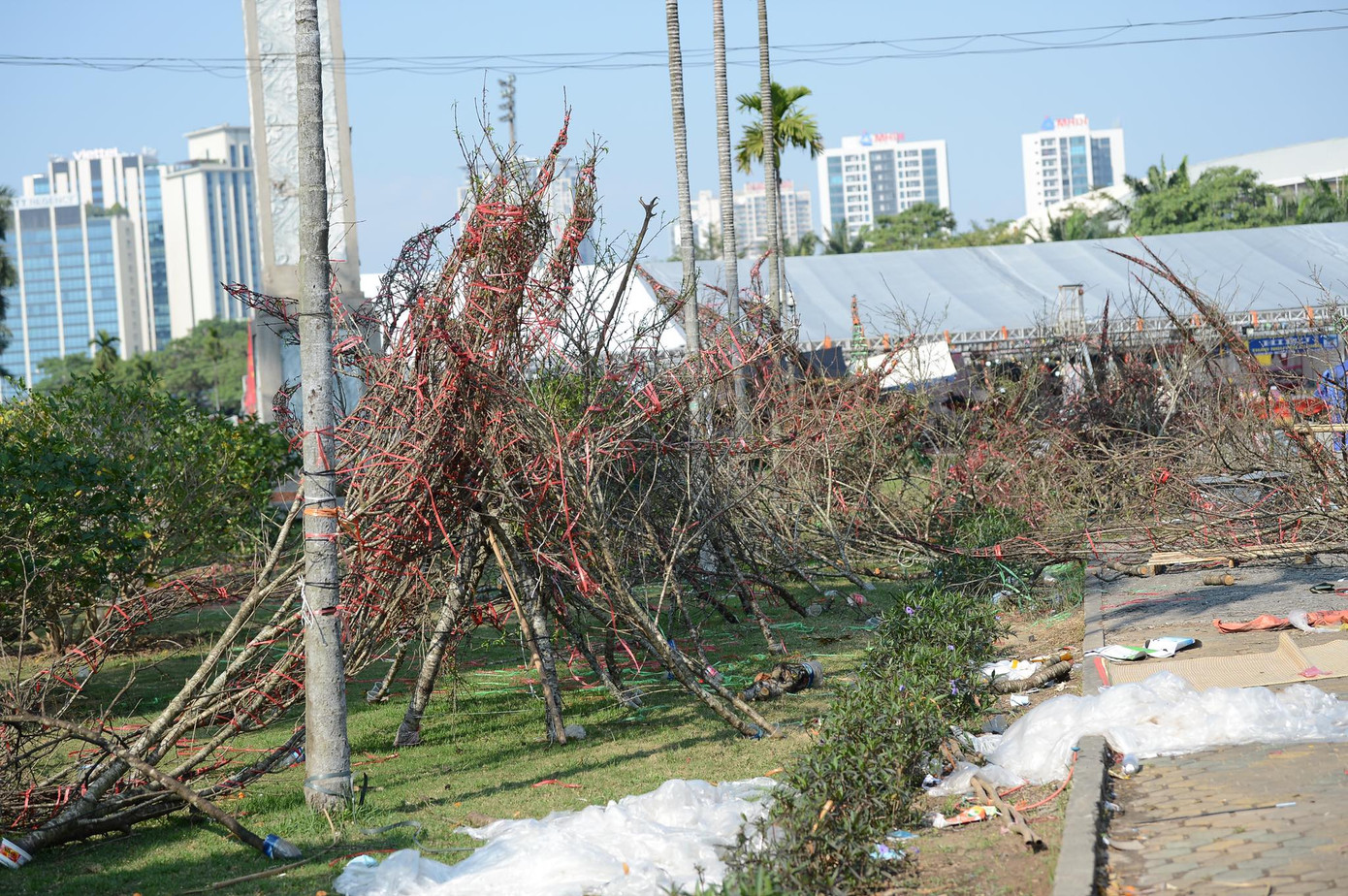 Đào rừng được dán tem chịu cảnh ế ẩm. Trong ảnh: Hình ảnh đào rừng ngổn ngang không người mua trên đường Kim Đồng (Hoàng Mai, Hà Nội) chiều 30 Tết