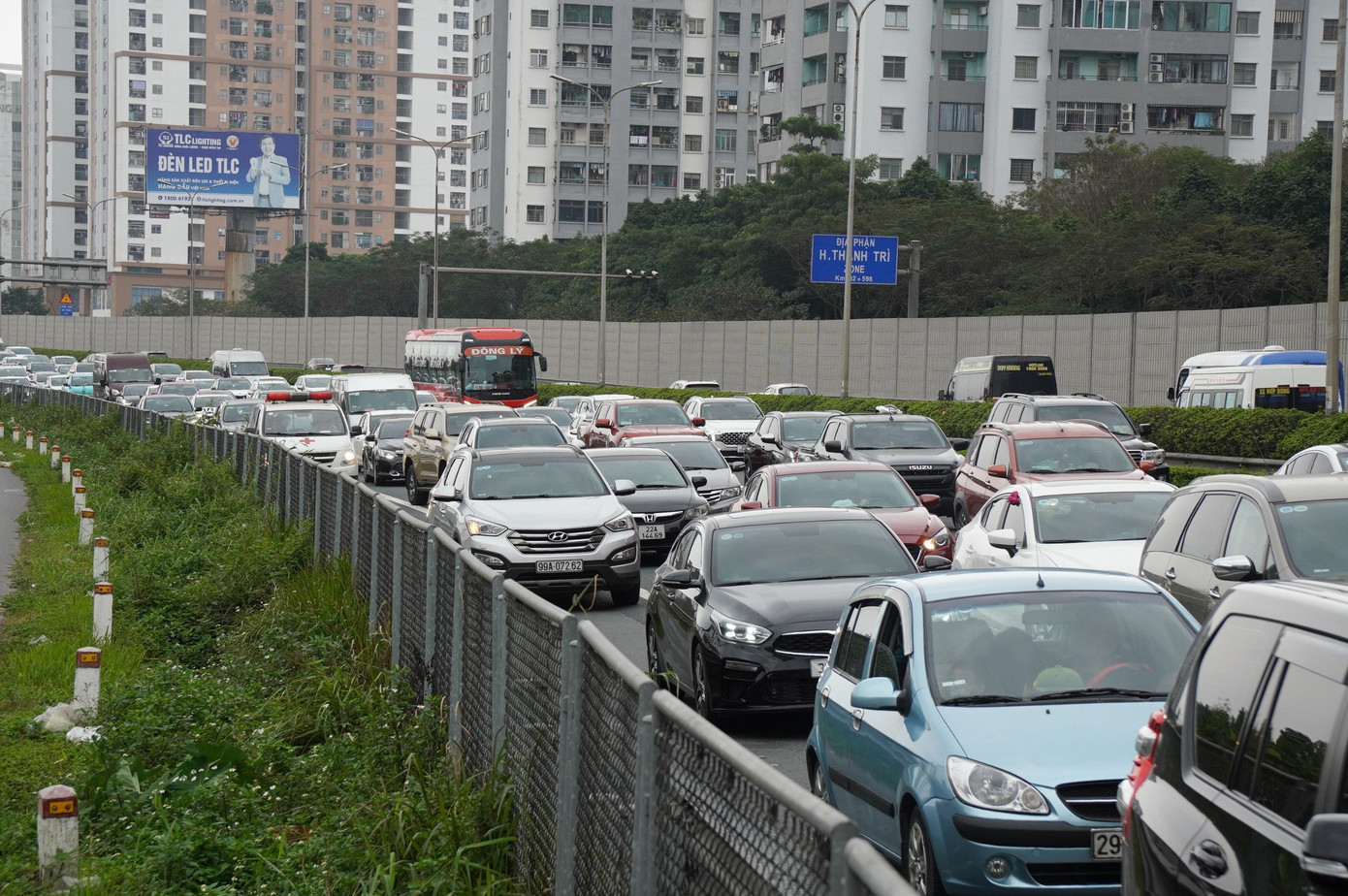 Ba làn đường ngoài và một làn khẩn cấp trên cao tốc hướng vào nội đô, ôtô đông đúc xếp hàng dài hai km, nhích từng chút một.