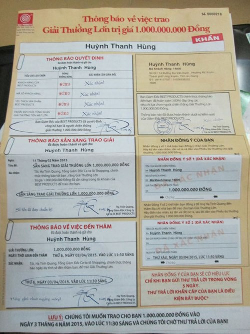 Trên thông báo (ảnh) gửi ông Hùng ghi: “Tôi, Hạ Tinh Quang, Giám đốc Công ty Ca-tô-lô Shopping chính thức thông báo tới bạn rằng giải thưởng lớn trị giá 1 tỉ đồng đã sẵn sàng trong tài khoản của BEST PRODUCTS để trao cho bạn. Tôi, Hạ Tinh Quang, dự tính lúc 11 giờ 30 ngày 3.4.2015 sẽ đến thăm bạn ở nhà riêng tại TP.Long Xuyên để trao giải thưởng lớn”.
