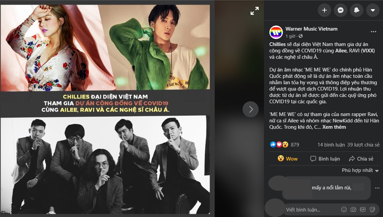 Mới đây, Warner Music Vietnam thông báo việc Chillies sẽ đại diện Việt Nam tham gia dự án cộng đồng. Dự án này mang tên ME ME WE do chính phủ Hàn Quốc phát động sẽ là dự án âm nhạc toàn cầu nhằm lan tỏa hy vọng và thông điệp yêu thương để vượt qua đợt dịch COVID-19. Lợi nhuận thu được từ dự án sẽ được gửi đến các quỹ ứng phó COVID-19 tại các quốc gia.