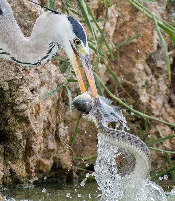 Nữ sinh viên 19 tuổi Inaganti Kumar ở Ấn Độ rất bất ngờ khi chứng kiến cảnh chim diệc tranh giành mồi săn với rắn. Con chim diệc lặn xuống nước để săn cá, nhưng khi nó nhô lên khỏi mặt nước, con cá đang nằm trong miệng một con rắn. Cả hai loài ăn thịt đều cắn chặt mồi và giằng co kịch liệt, quyết không nhường cho đối phương.