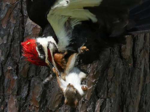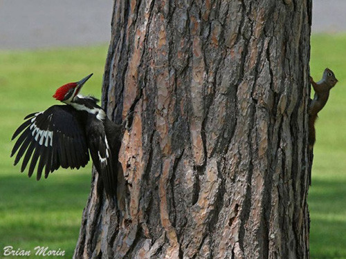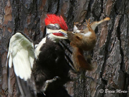 Theo CBC News, Brian Morin, nhiếp ảnh gia ở Cornwall, Canada, tình cờ chụp được hình ảnh trên hồi đầu tháng 6. Một con sóc đỏ leo lên cây đôi chim gõ kiến pileated ở.