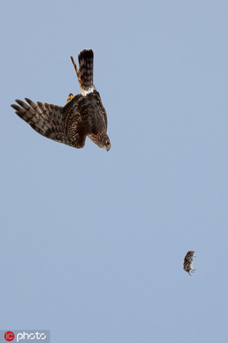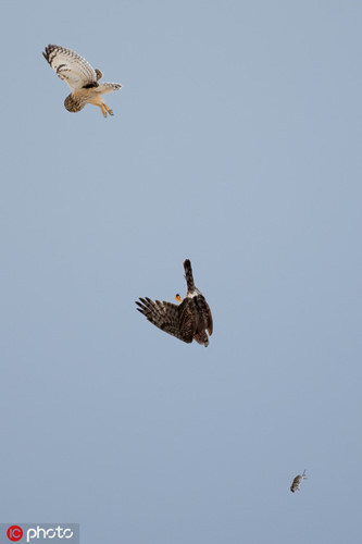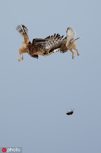 Được biết, chim cú tai ngắn và chim ưng đuôi trắng chiến đấu dữ dội để tranh giành con mồi là một con chuột đồng.