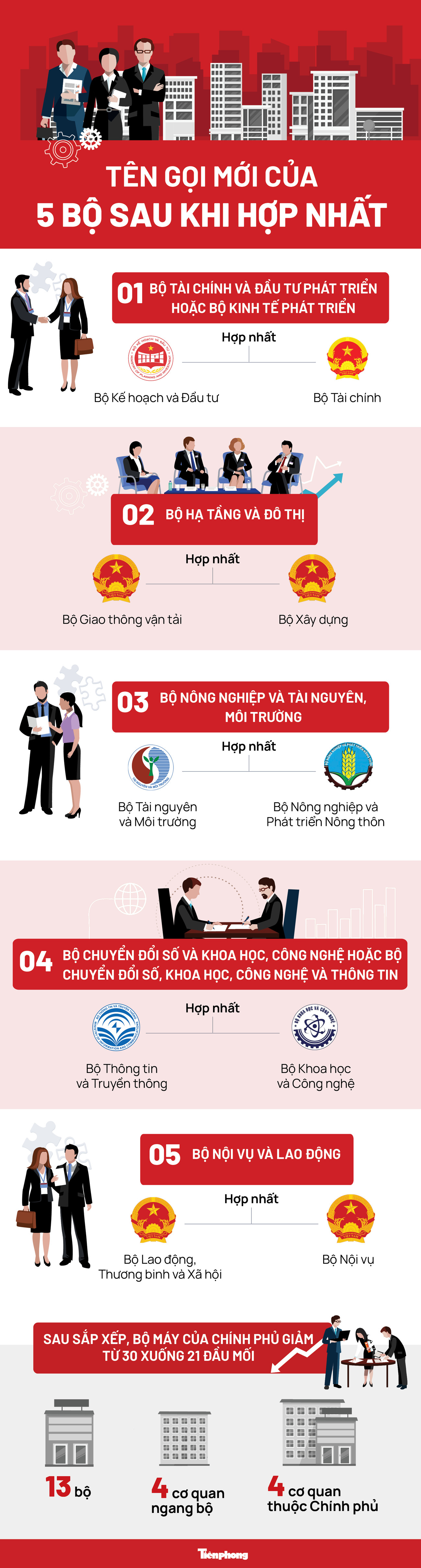 Bộ trưởng Nội vụ Phạm Thị Thanh Trà cho biết, theo định hướng của Ban Chỉ đạo Trung ương về tổng kết việc thực hiện Nghị quyết số 18-NQ/TW, sau khi sắp xếp, sáp nhập, tổ chức bộ máy của Chính phủ giảm 5 bộ, 4 cơ quan thuộc Chính phủ. Như vậy, bộ máy của Chính phủ sẽ được tinh gọn từ 30 xuống còn 21 đầu mối (giảm 9 đầu mối) gồm: 13 bộ, 4 cơ quan ngang bộ và 4 cơ quan thuộc Chính phủ.