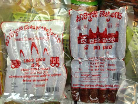 Cả chợ có trên dưới 10 sạp khô. Ngoài hàng trăm loại khô, người đến chợ còn có thể tìm được xà-rông, trang phục truyền thống đặc trưng của người Campuchia, bia Angkor, lạp xưởng, lá sầu đâu, mì gói Campuchia,... Chị Hà hai tay giơ hai gói lạp xưởng, một gói màu sậm in rặt chữ Khmer, một gói màu nhạt hơn in song ngữ Việt-Khmer, ghé tai khách nói: "Loại có tiếng Việt là bên này làm nhái giá 70.000 đồng, rẻ hơn 30.000 đồng so với lạp xưởng bên kia làm. Chất lượng lạp xưởng Campuchia thì có tiếng từ lâu, thành ra cứ dịp Tết đến là nhiều khách quen cứ tìm đến mua đúng 'lạp xưởng Miên' mà thôi".