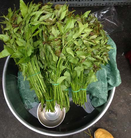 Chị Tư đứng sạp kế bên, tay loay hoay tưới ướt mớ lá sầu đâu, tận tình chỉ khách cách làm gỏi với loại lá này: "Dân miền Tây gốc Khmer chuộng món gỏi sầu đâu này lắm. Nhiều người mới ăn lần đầu nhăn mặt vì khó ăn, đắng chát, nhưng người biết trộn sẽ chọn lá non và bông sầu đâu vị sẽ bớt đắng. Xé nhỏ lá, trộn với chút khô cá sặc hoặc cá lóc xé nhuyễn, thêm vào vài lát thịt ba rọi, lát dưa leo với chút ớt chấm với nước mắm tỏi ớt là "bài bản" luôn". Chỉ khoảng 7.000 đồng đổ lại một bó, lá sầu đâu là một trong những món tươi luôn đắt hàng ở chợ.