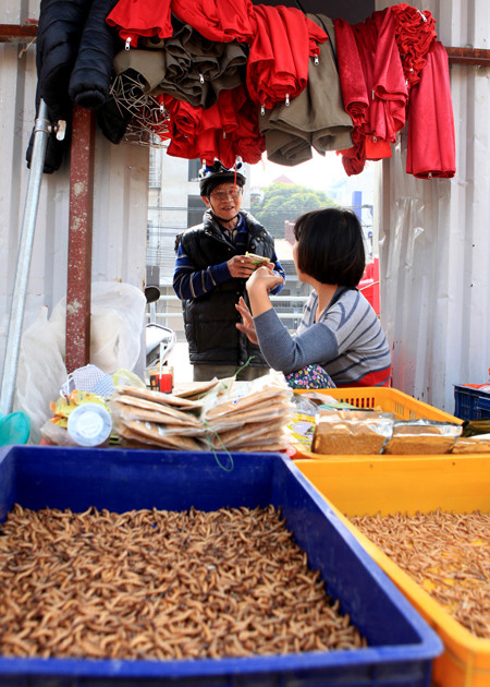 Không chỉ có chim, chợ còn bán nhiều thức ăn cho loài động vật cảnh này, từ bột cám công nghiệp tới sâu, cào cào, châu chấu. Những con chim non thường ăn các loại côn trùng, sau đó sẽ dần dần trộn chung với cám để luyện cho quen. Nhiều loại cám bày bán ở chợ được sản xuất riêng ra cho từng loại chim.