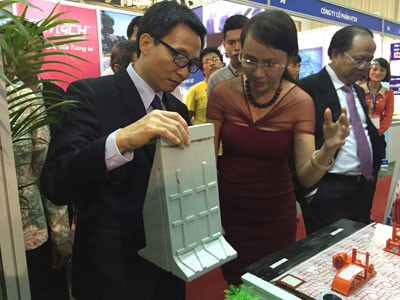 Bà Đào Thị Thu Thảo, Giám đốc chi nhánh Busadco miền Bắc giới thiệu với Phó Thủ tướng Vũ Đức Đam các sản phẩm kè biển, sông, hồ, kênh, rạch của Busadco.