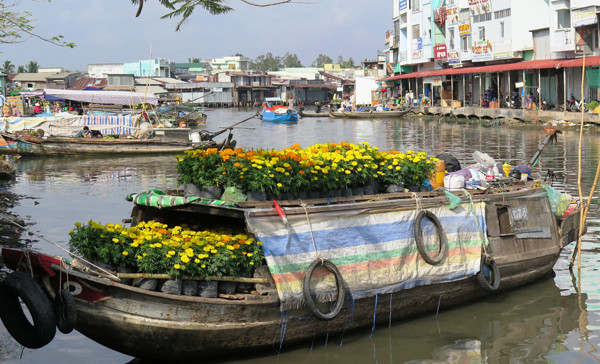 Ghe chở hoa tươi cặp bến sông Cà Mau.