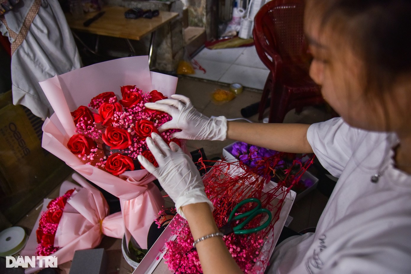 Tranh thủ lúc vắng khách, tiểu thương ngồi trang trí sẵn các bó hoa hồng để chuẩn bị bán cho khách, nhiều người hi vọng trong những ngày tới sẽ bán được nhiều hoa.
