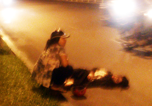 Cô gái nằm bất tỉnh giữa đường sau khi bị cướp xe. Ảnh: Ngôi Sao