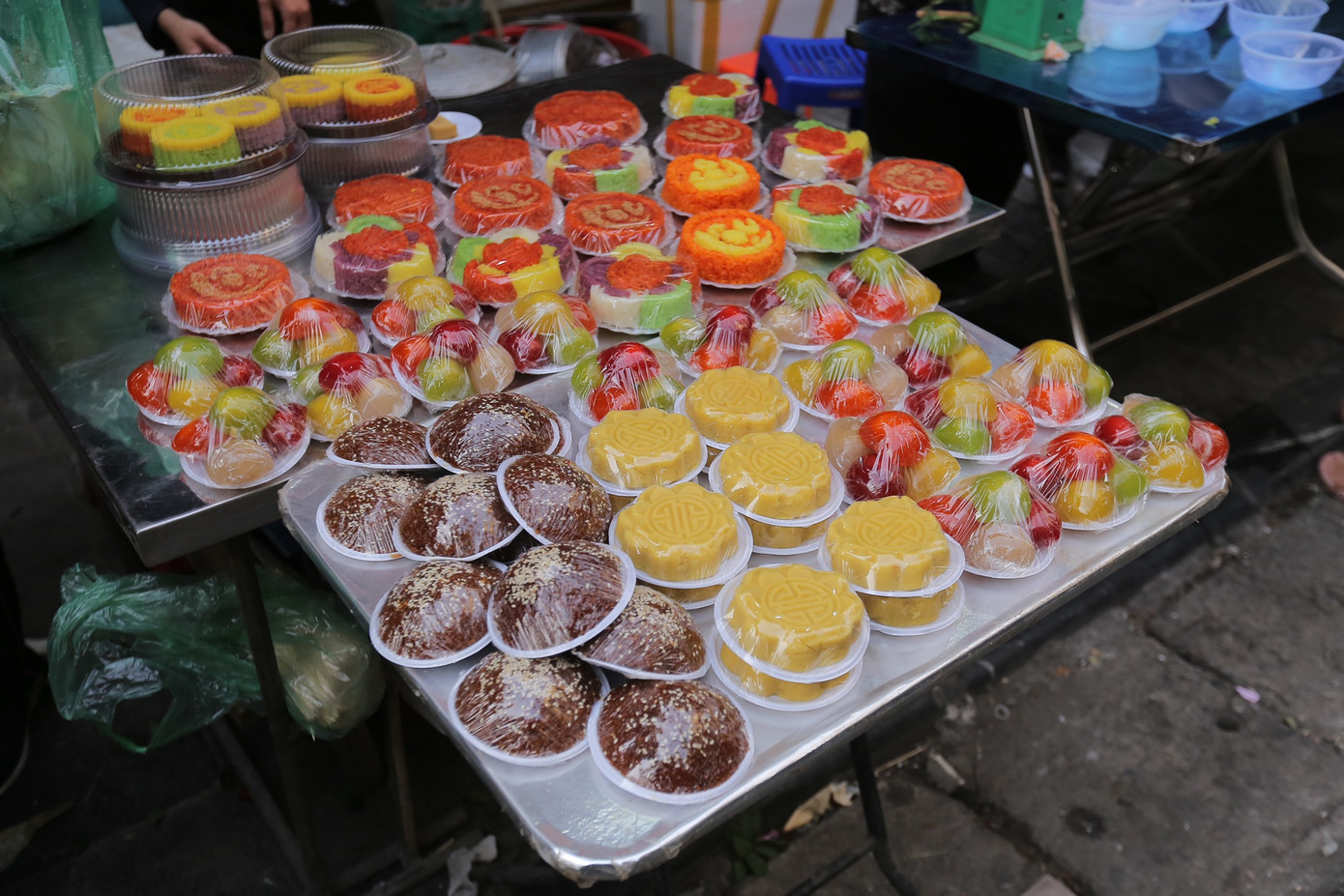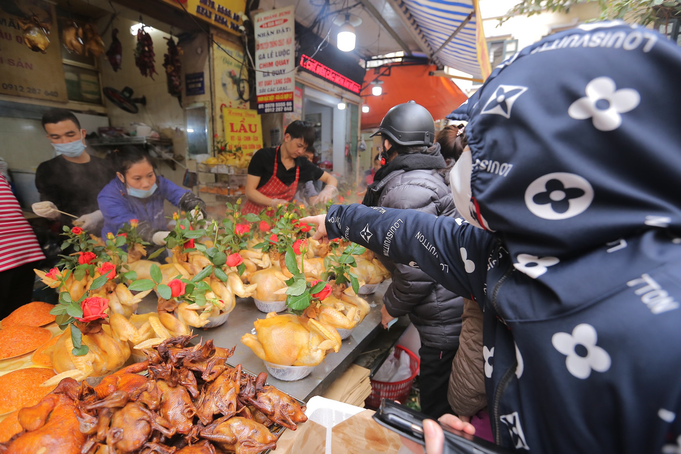 | Mặt hàng đặc trưng của khu chợ những ngày cận Tết là gà luộc ngậm hoa hồng. Hai cửa hàng nổi tiếng bán sản phẩm này nằm ở đoạn phố Gia Ngư luôn trong tình trạng tấp nập. Những con gà da vàng óng ả, tạo hình bắt mắt nặng khoảng 2kg được bán với giá từ 600.000 - 800.000 đồng. |