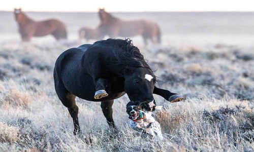 Maggie vô tình đi qua đàn ngựa trong khi giúp con chim ưng của Palmer săn gà gô tại sa mạc đỏ ở Wyoming, Mỹ. Nó may mắn không bị thương sau khi thoát khỏi hàm răng và vó ngựa.