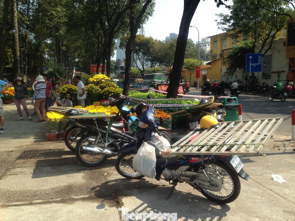 Xe máy được lắp thêm baga, trang bị dây chằng xếp hàng, sẵn sàng phục vụ khách mua hoa.