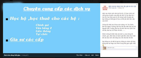 Không chút úp mở, một trang học hộ đăng tải thông tin sẵn sàng “đáp ứng nhu cầu của các bạn, chúng tôi tiếp nhận học thuê, học hộ các trường tại Hà Nội (học thuê hệ chính quy, học thuê tại chức, học thuê văn bằng 2, học thuê cao học, các khóa học đào tào bồi dưỡng kiến thức...)