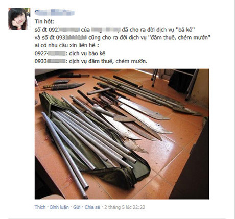 Bên cạnh lời đăng tải về việc sẵn sàng “đâm thuê, chém mướn” cùng công khai số điện thoại, thành viên này còn “khuyến mãi” hình ảnh là các vũ khí đáng sợ như dao, mã tấu, …