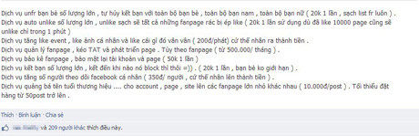 Chính những lời rao này cũng mở rộng thêm cả dịch vụ tăng số người “like” status (chia sẻ trạng thái), bức ảnh cho người dùng có nhu cầu. Giá cả dịch vụ cũng vì thế “nhấc lên đặt xuống” theo thỏa thuận nhưng cũng trung bình vài trăm đồng cho một lượt “like” hay “subcribe”.