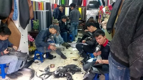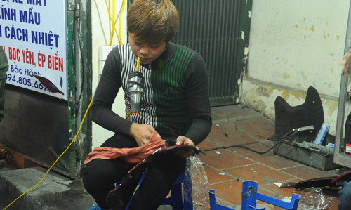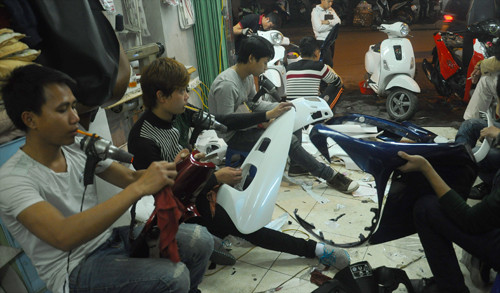 Lực lượng đông đảo những người thợ thực hiện việc dán ni lông hoặc giấy màu lên vỏ xe theo yêu cầu của khách