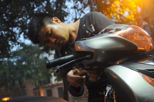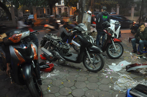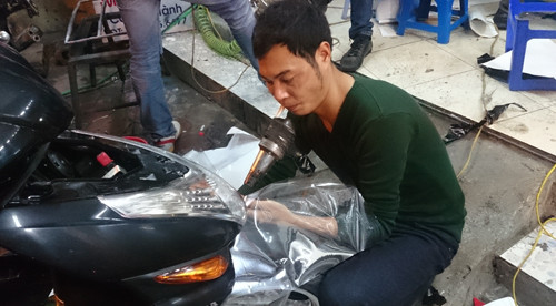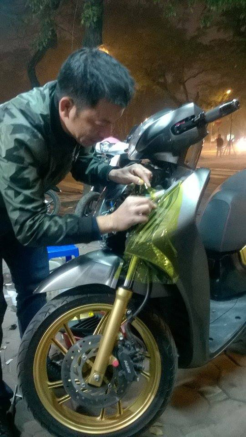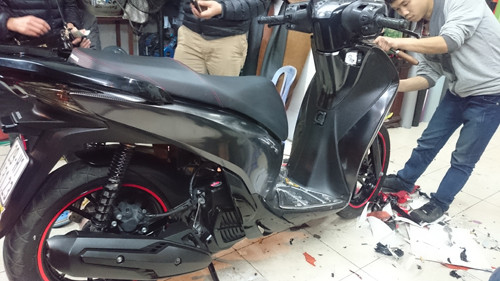 Những người thợ dán xe cho biết, nhiều xe SH đã dán đi dán lại mấy lần nên khi dán lại phải tốn thêm thời gian bóc tấm dán cũ ra. Sau đó họ dùng giẻ tẩm xăng để đánh sạch lớp keo còn bám trên thân xe rồi mới tiến hành tân trang lại được