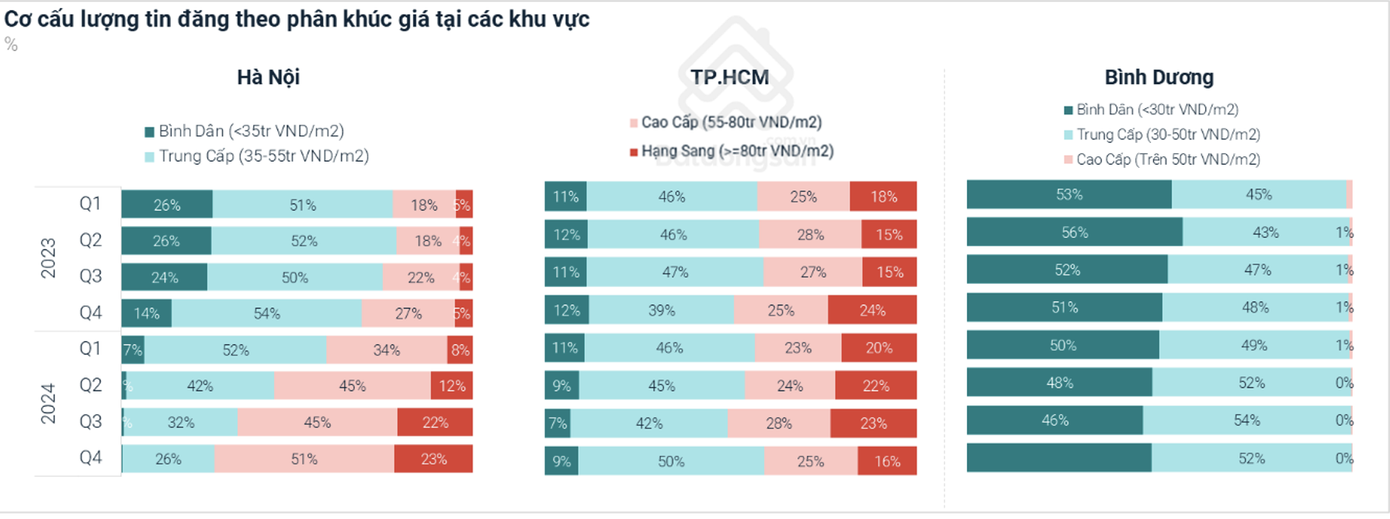 Theo dữ liệu Toàn cảnh thị trường chung cư Bình Dương 2024 của batdongsan.com.vn, tính đến quý IV/2024, tỷ lệ căn hộ cao cấp và hạng sang ở Hà Nội và TPHCM lần lượt là 74% và 41%. Trong khi đó, nguồn cung căn hộ phân khúc này tại Bình Dương lại khan hiếm.
