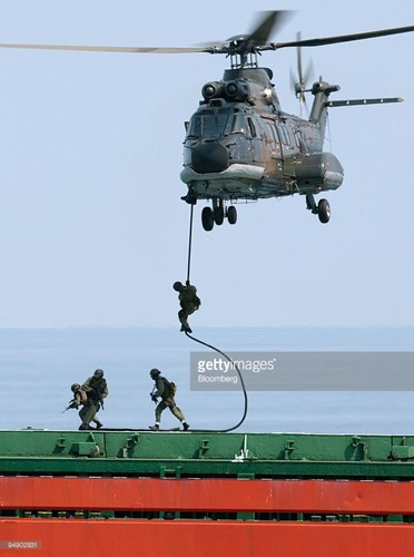 Lực lượng biệt kích thuộc Hải quân Singapore huấn luyện tác chiến chống khủng bố trên biển với trực thăng vận tải đa năng AS332 Super Puma.